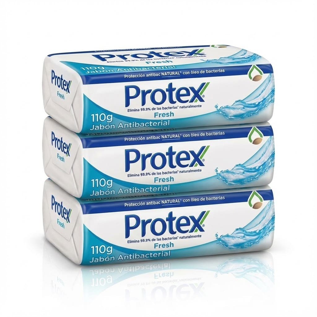 Jabón de tocador Protex Fresh con fórmula antibacterial que protege tu piel diariamente. Su presentación de 110g es ideal para el uso en baño y lavamanos, ofreciendo limpieza profunda y efectiva. Enriquecido con ingredientes que mantienen la piel hidratada y suave, este jabón es perfecto para toda la familia. Protex Fresh combina higiene superior con un aroma fresco y duradero que te acompaña durante el día.