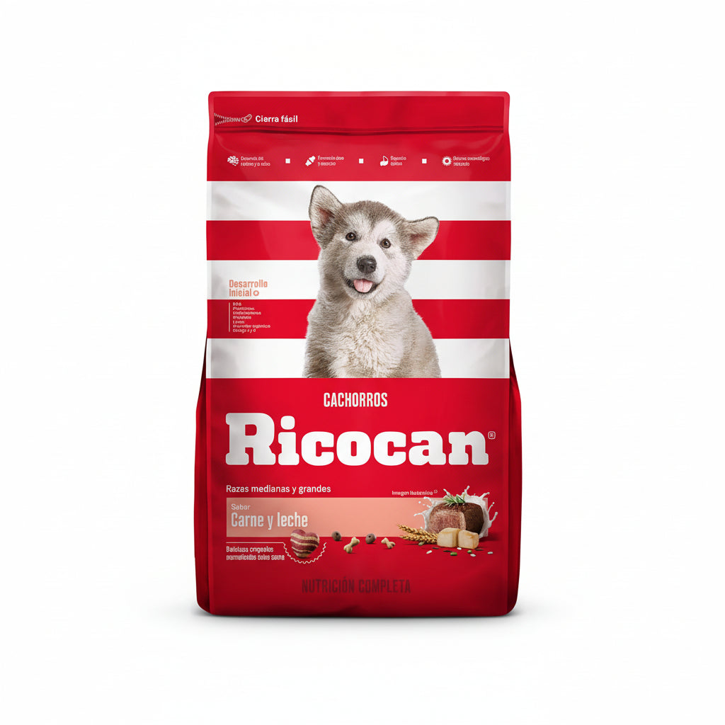 Alimento completo y balanceado especialmente formulado para cachorros de razas medianas y grandes. Esta presentación de 15 kg proporciona los nutrientes esenciales necesarios para un crecimiento óptimo, incluyendo proteínas de calidad, grasas y minerales que fortalecen huesos y dientes en desarrollo. Ricocan Cachorro está diseñado para apoyar el sistema inmunológico y favorecer una digestión saludable durante esta etapa crítica del crecimiento. Ideal para mantener a tu cachorro fuerte, activo y bien nutrido.