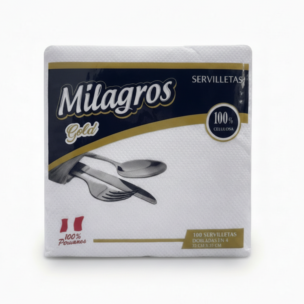 Servilleta de papel blanco marca Milagros en formato 33cm x 33cm, plegada en cuatro para conveniencia inmediata. Especialmente formulada para establecimientos de gastronomía, hoteles y servicios de catering que requieren productos de calidad consistente. Su capacidad de absorción superior y resistencia estructural garantizan desempeño confiable en ambientes de alto uso. El tamaño generoso proporciona cobertura amplia, mientras que el plegado facilita distribución y almacenamiento eficiente. Opción profesional para mantener estándares de higiene y presentación en cualquier servicio.