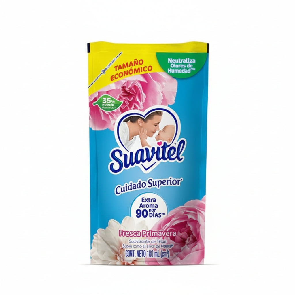 Suavizante Suavitel Fresca Primavera en presentación doypack de 180ml. Fórmula concentrada que suaviza las fibras de tus prendas mientras proporciona un aroma fresco y floral característico de la primavera. Ideal para el cuidado diario de ropa delicada y tejidos sensibles. Una botella práctica y económica que rinde múltiples lavadas. Deja tus prendas suaves, perfumadas y con mayor durabilidad. Producto de confianza para hogares que buscan calidad y frescura en cada colada.